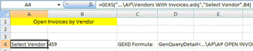 The GEXS formula opens a selector panel, with the values returned from the specified query. Selected values from the first column are then returned to Excel.